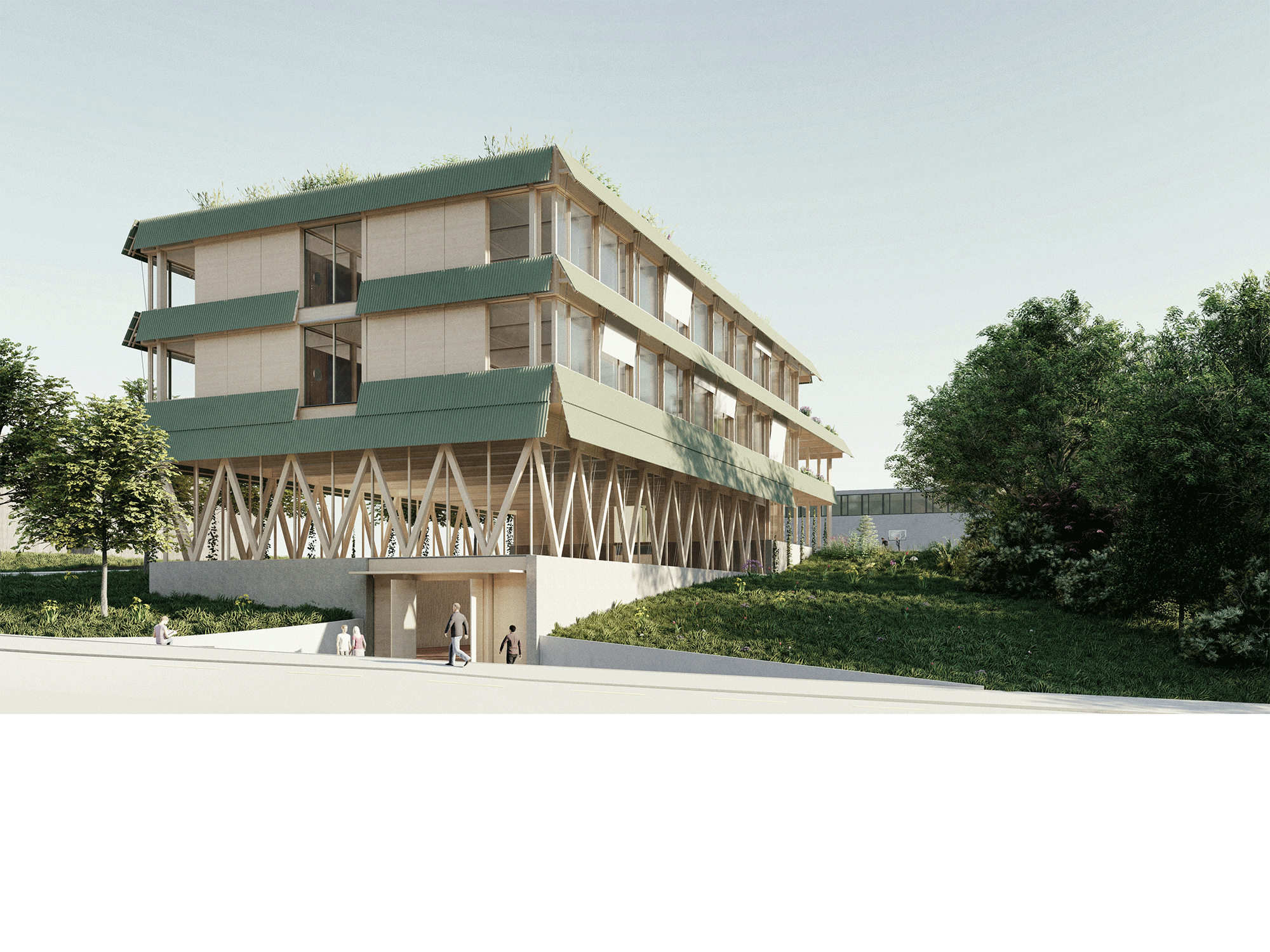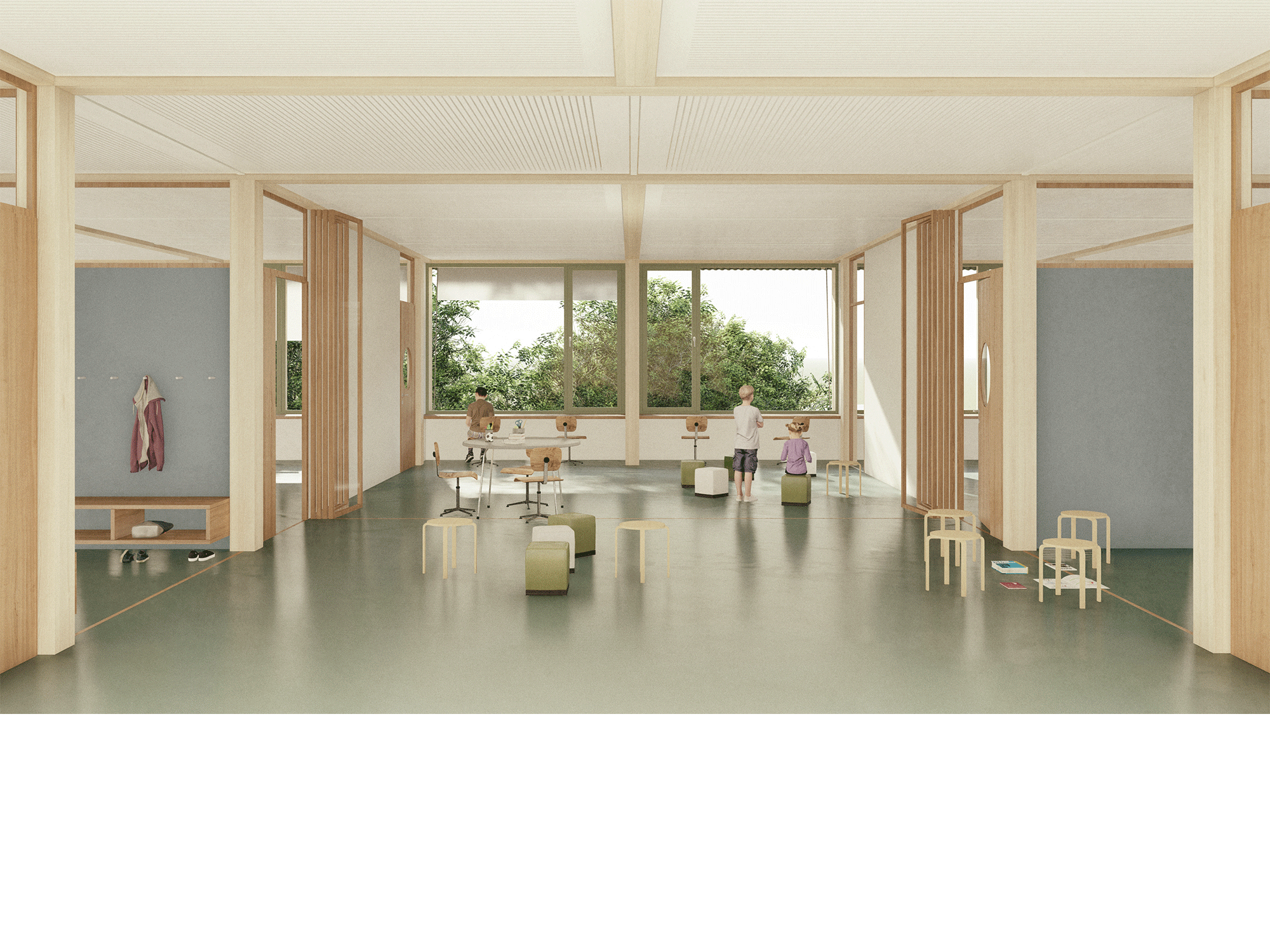 Der Eingang des Erweiterungsbaus orientiert sich zum bestehenden Schulgebäude und führt über unterschiedliche Zugänge zur Turnhalle und eine gedeckte aussenliegende Treppenanlage zu den Schulzimmern und der Tagesstruktur. Die Tragstruktur aus Holz ist sowohl an den Fassaden als auch in den Innenräumen prägend. In deren regelhaftem Aufbau finden in einer Reihe Haupt- und Nebenräume der Schulnutzung Platz und lassen flexibel zukünftige Nutzungsänderungen zu. Der Aussenbereich der Tagesstruktur liegt auf einer Terrasse gegen die Schulanlage.